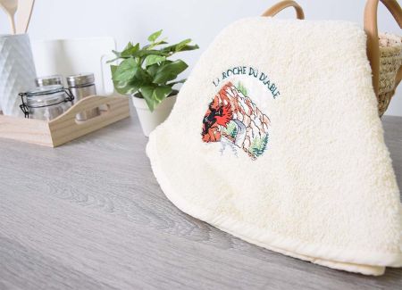 Description: Cet essuie-mains brodé Roche du diable emblème de notre belle ville Gérardmer qui sublimera votre cuisine. Absorbants et résistants, notre gamme d'essuie mains nid d'abeille saura répondre à vos exigences. Les broderies réalisées dans nos ateliers à Gérardmer vous garantissent la qualité et le savoir faire de notre région.